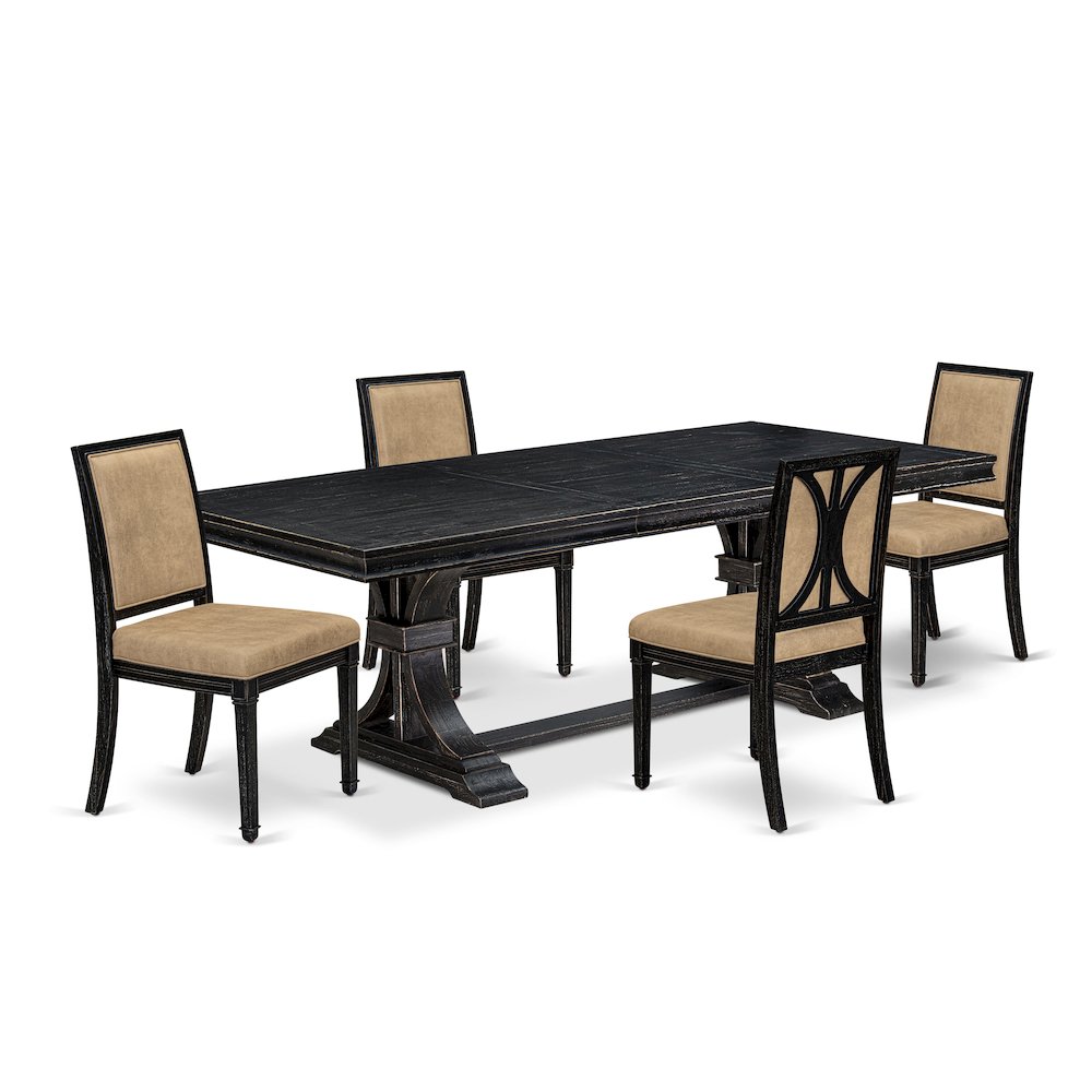 Explore the unparalleled sophistication of Luxy by East West Furniture, a distinguished luxury furniture brand. Luxy introduces a captivating kitchen table set meticulously crafted to bring rustic allure into your dining area. Our expertly designed 5-piece dining table set is crafted to enhance your dining space with sophistication and utility. Featuring a spacious Removable leaf kitchen table and 4 stylish modern dining chairs, each element is tailored to enrich your dining experience. The chairs feature opulent Dark Grey PU Leather upholstery, complemented by a delightful High backrest for an added touch of elegance. With PU Leather upholstery, the seats ensure comfort during extended meals or gatherings. The tabletop and base of the table exhibit a stunning sand blasting black finish, imbuing your decor with a hint of vintage charm. Constructed from durable Acacia Wood, this dining set promises both aesthetic appeal and durability. Enhance your dining space with this enduring and versatile dining table set, perfect for both everyday meals and special gatherings. The chairs in this set are characterized by PU Leather seats and High backs, enriching the visual dimension and texture of your surroundings. Embrace the seamless integration of style and functionality with this welcoming addition to your home.