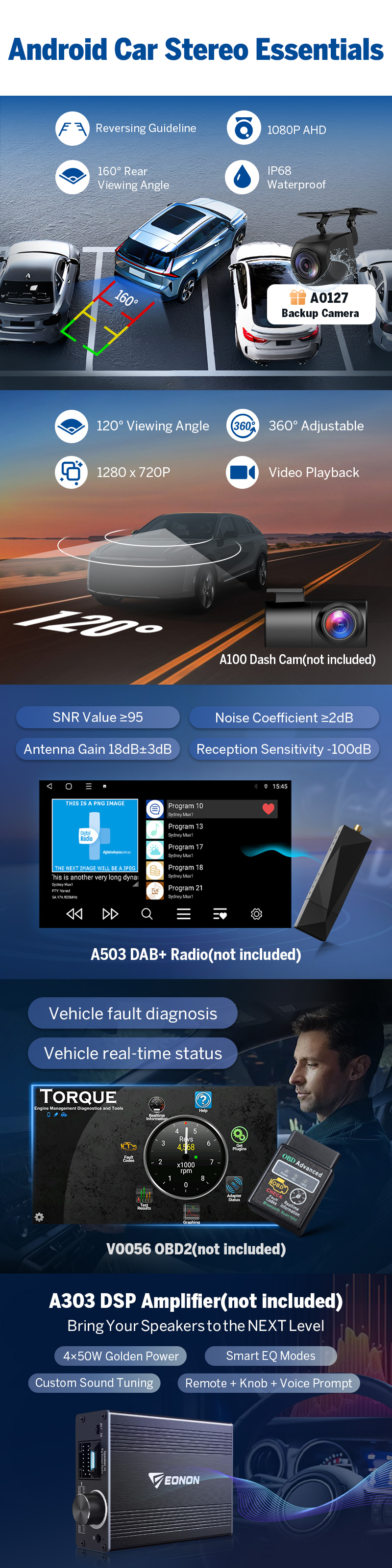 DAB+ & Radio Stability? ➡️ Yes—for UK, EU, and Australia, DAB+ works with the optional DAB+ box (Eonon A503). FM/AM reception is very stable with ST TDA7708 RDS tuner, giving fast channel search and clear signals.