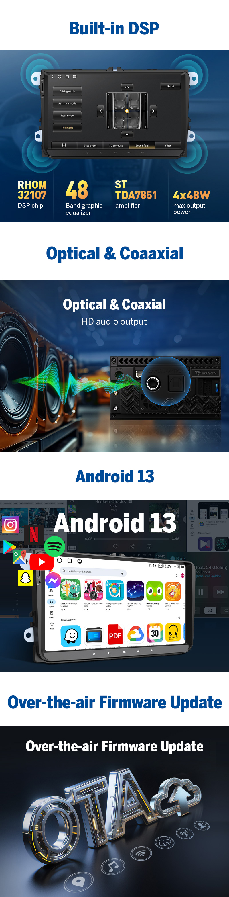 Sound Quality Upgrade? ➡️ Yes! Features a 48-band DSP, time alignment, EQ presets, plus optical & coaxial digital outputs for premium sound—even with stock speakers.