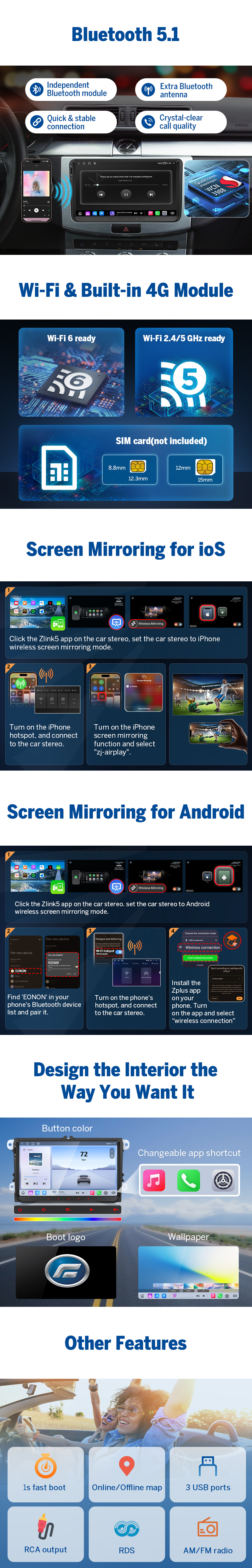 4G LTE & Internet Connectivity? ➡️ We ship the correct regional LTE version based on warehouse location: ● US warehouse → U-Version (USA/Canada/Mexico) ● UK or AU warehouse → E-Version (UK/Europe/Australia/NZ) This ensures the best match with local LTE frequency bands. A SIM card is only needed for built-in mobile data. All key functions—CarPlay/Android Auto, offline GPS, radio, Bluetooth, and USB—work without a SIM. Hotspot/WiFi also works fine in all regions.