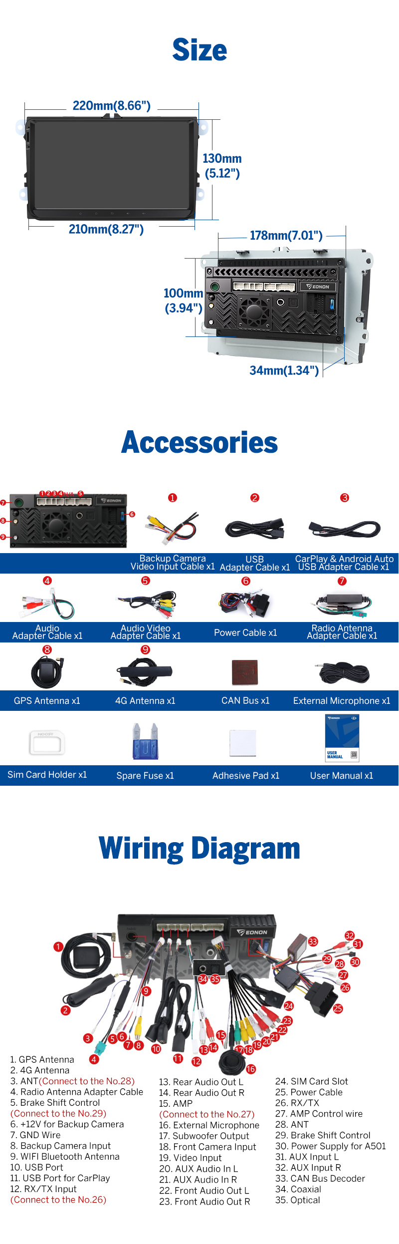 | Support | OBD2, DVR, 4G, 3G, Backup camera |