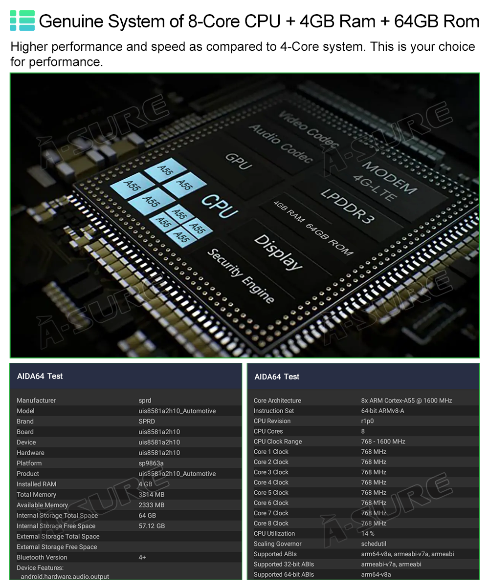 | CPU Core | Octa Core CPU ARM Cortex A55*8, 1.6GHz*8 |