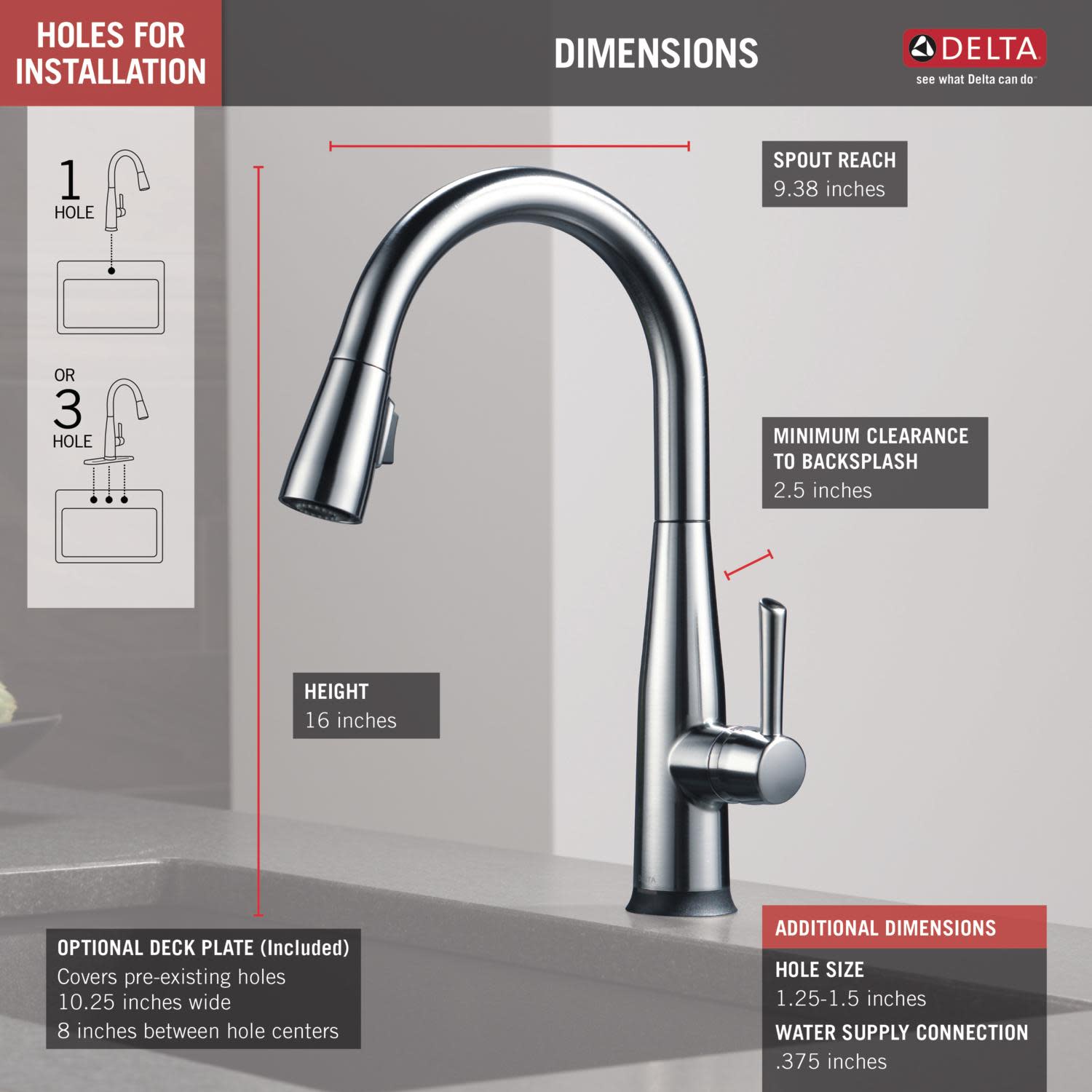 - Faucet includes an optional escutcheon plate to cover unused faucet holes