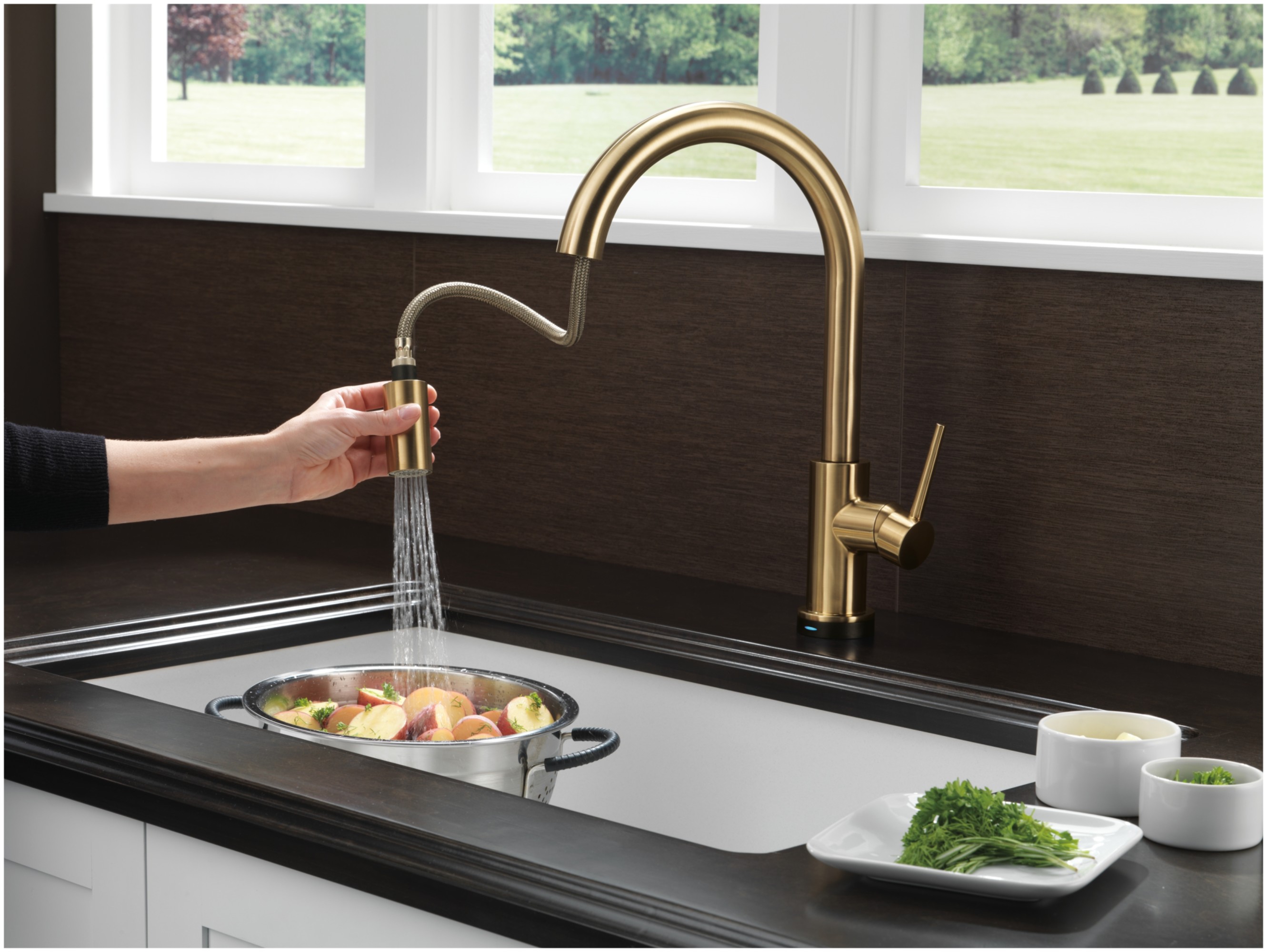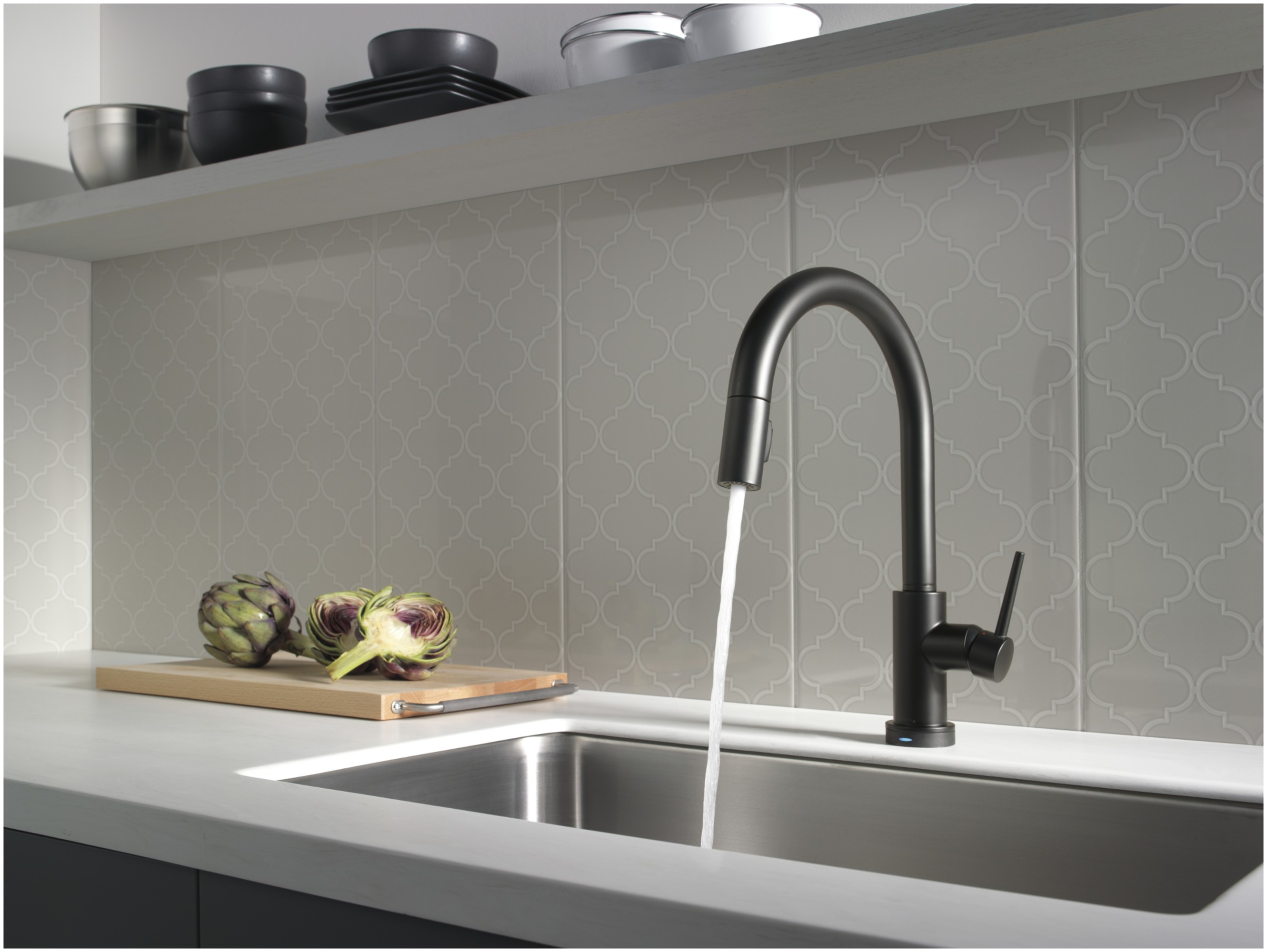 Touch2O® Technology: Sometimes your hands could use a hand, which is why we designed Delta® Touch2O Technology for the kitchen. With a simple touch anywhere on the spout or handle using your wrist or forearm, you can start or stop the flow of water from your faucet. The temperature and flow rate are easily set by your faucet handle for simple operation, designed to make everyday kitchen tasks a little easier. The built-in Delta TempSense™ LED light at the base of the faucet indicates the temperature of the water, eliminating any possible surprises or discomfort. Touch it on. Touch it off. Experience the convenience and control of Delta kitchen faucets featuring Touch2O Technology.
