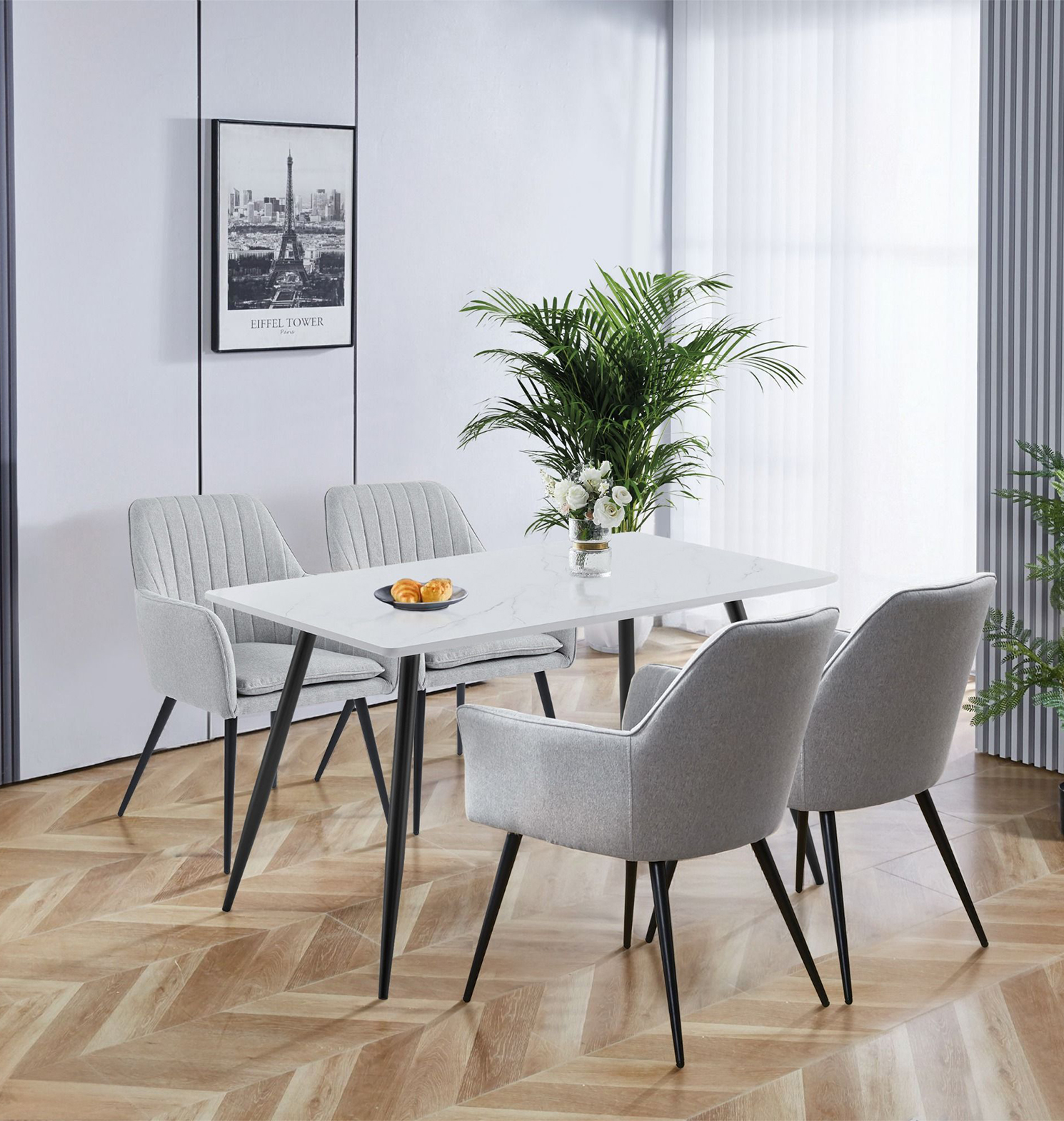 Dining Set, White Marble Effect Top Kitchen Table (1.2m) & 4 Steel Grey Chairs