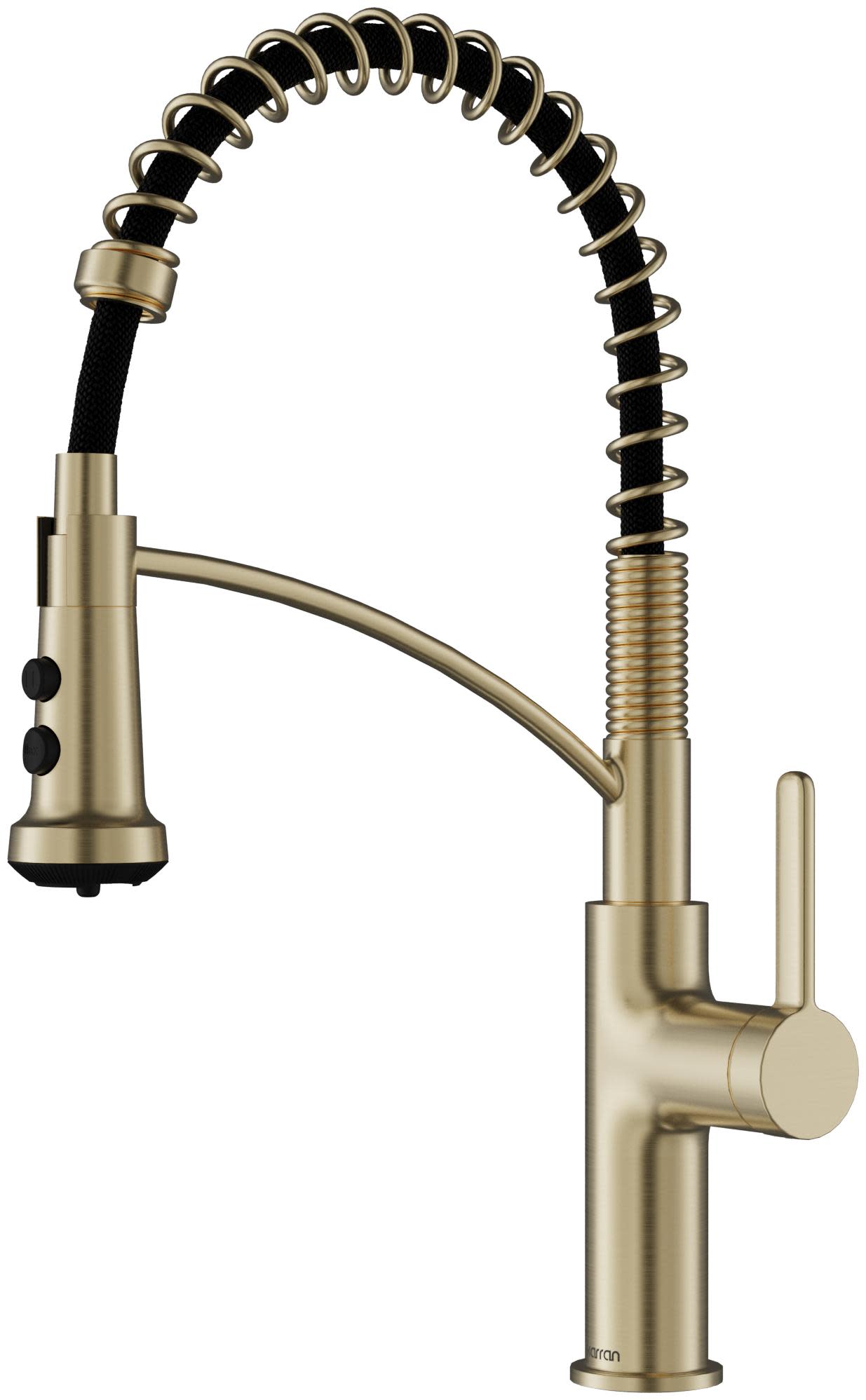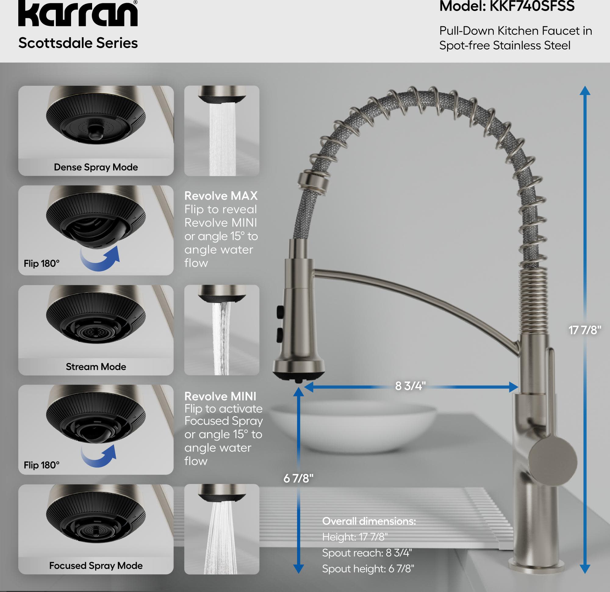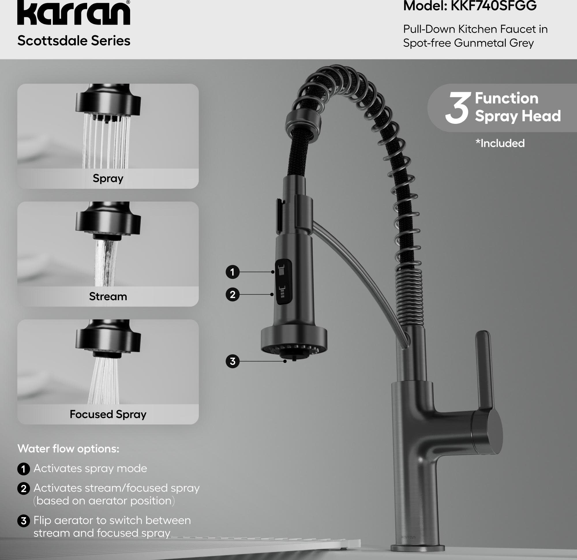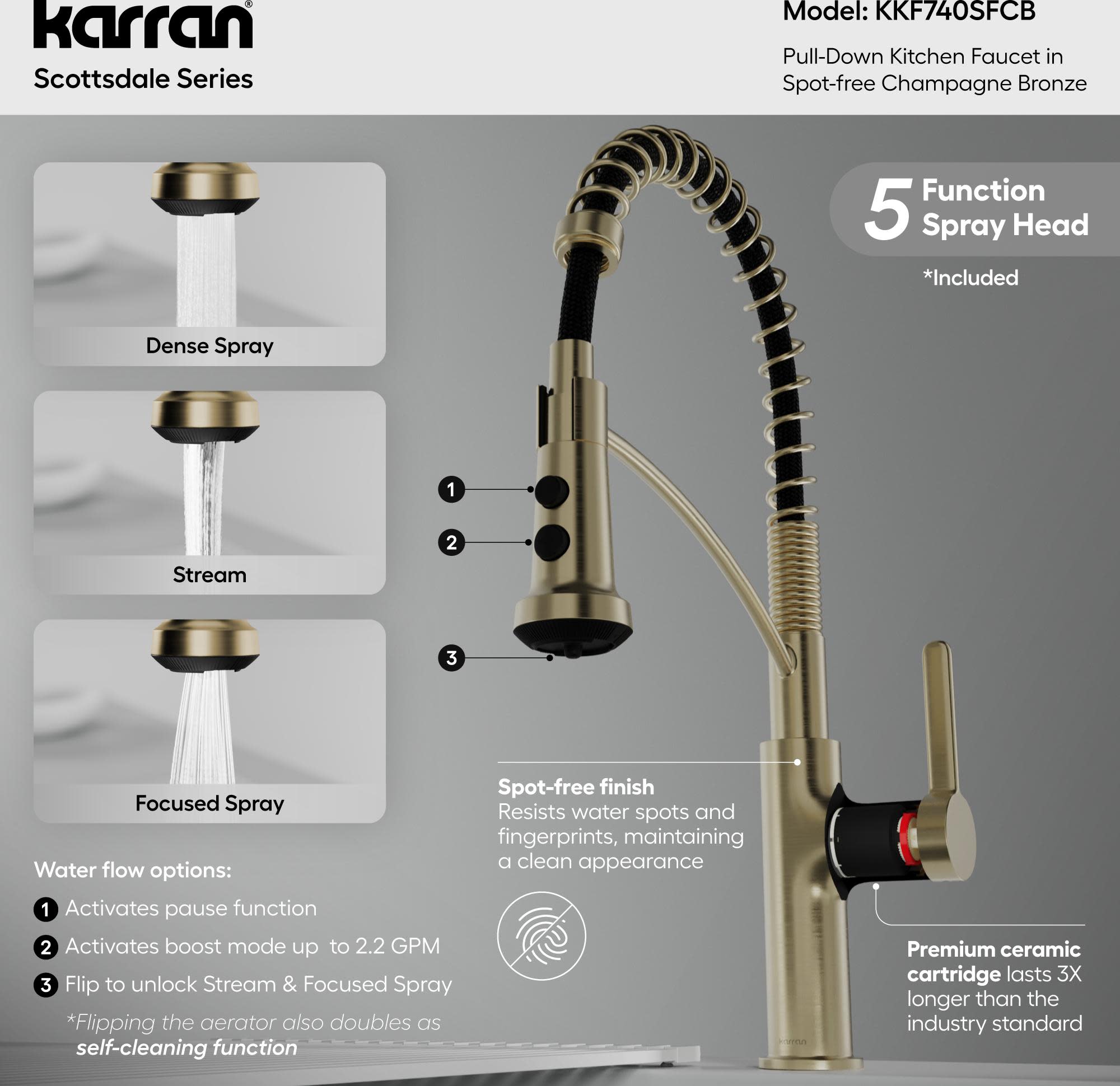 Item DescriptionKarran's Scottsdale series Single-Handle Pull-Down Kitchen Faucet redefines versatility with dual interchangeable sprayers and advanced Revolve aerator technology for professional performance at home. This innovative system includes two metal sprayheads: the 3-function Revolve Mini featuring a focused precision spray, stream, and rinse mode; and the 5-function Revolve MAX offering dense spray, stream, focused spray, pause, and max-flow boost up to 2.2 GPM. Both connect easily for customizable use. The commercial-style stainless-steel spring provides enhanced flexibility and modern appeal, while the 90 degree forward-rotating handle prevents backsplash interference and the 360 degree swivel spout delivers complete sink coverage. A 26-1/2 inch nylon braided hose offers extended reach and smooth retraction. Built with lead-free waterways, stainless-steel construction, and a commercial-grade cartridge rated for 1.5 million cycles, this faucet combines strength and function.