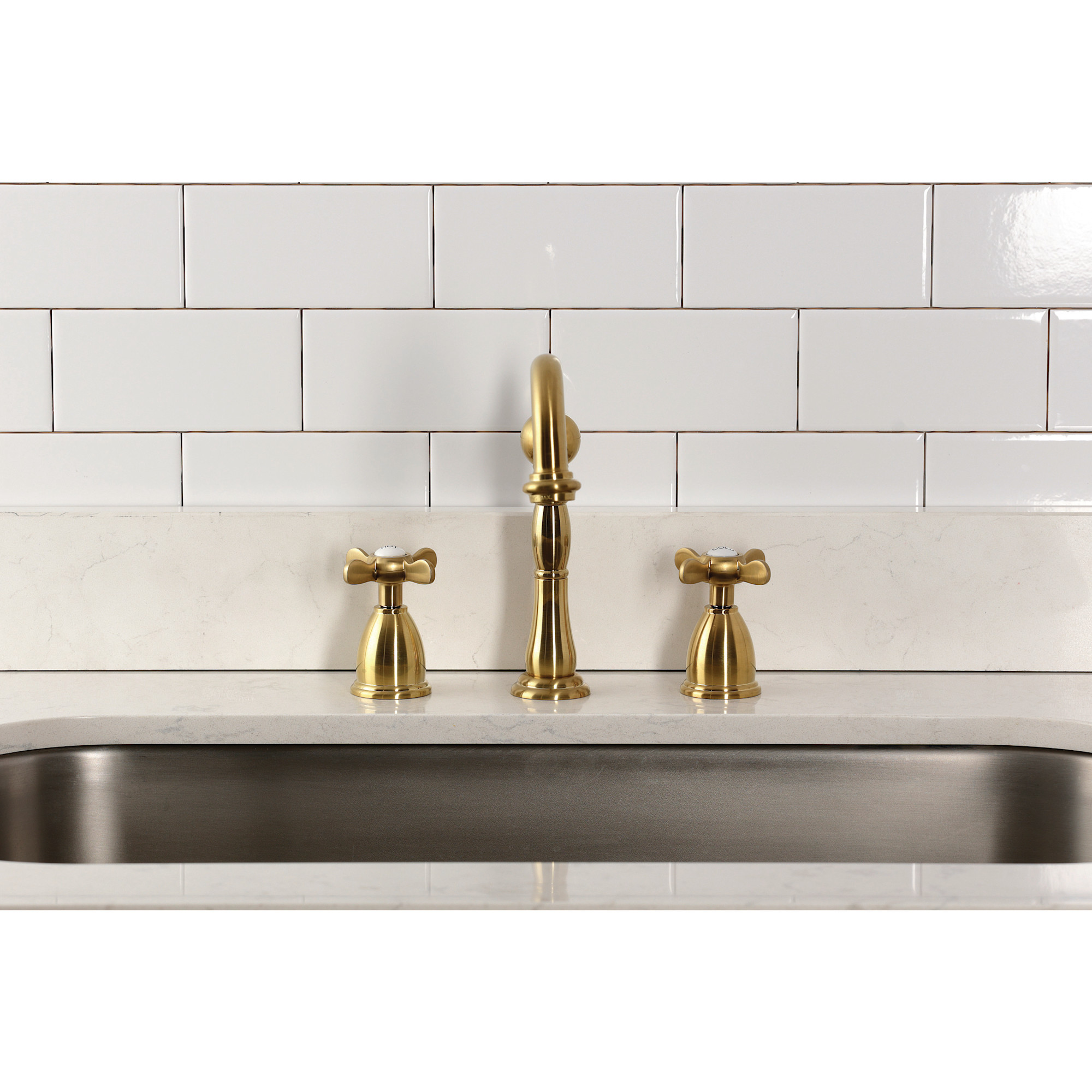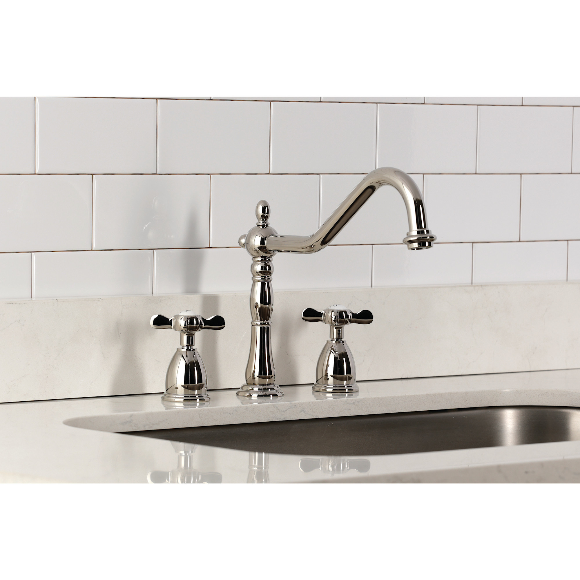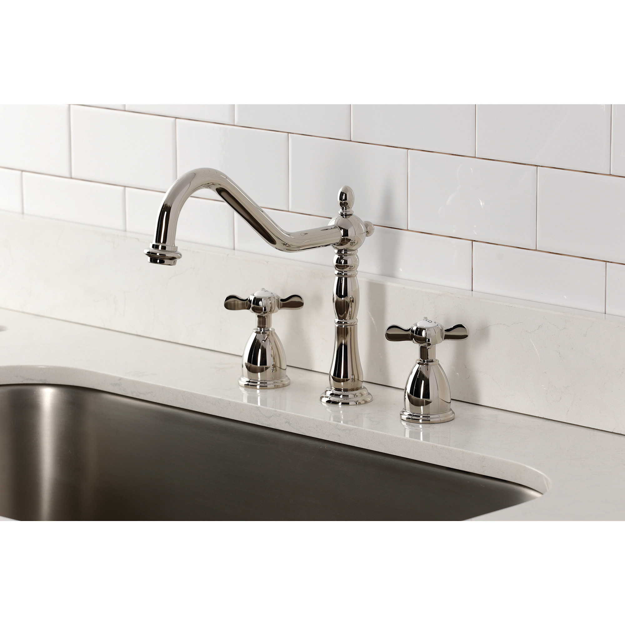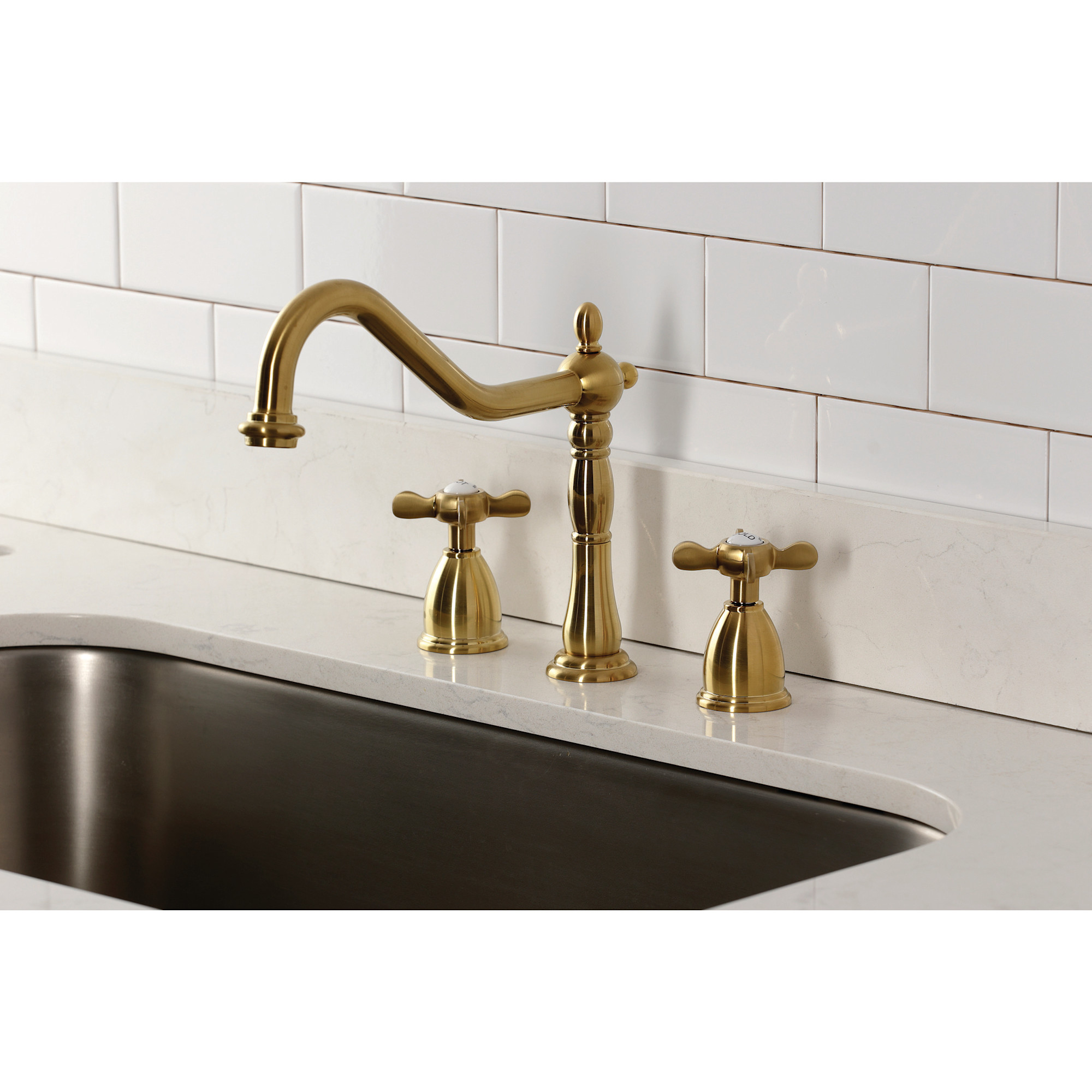 Item DescriptionThe spirit of the Victorian era finds itself elegantly and eagerly spun into the unique design of this faucet. Able to fit a variety of sink set-ups, widespread kitchen faucets can be utilized in several multi-hole configurations. These are ideal for larger kitchens, as they are more spread apart. The polished finish will also add a glistening elegance to your kitchen ensemble. Allow the brass construction to provide a sturdy and reliant fixture.