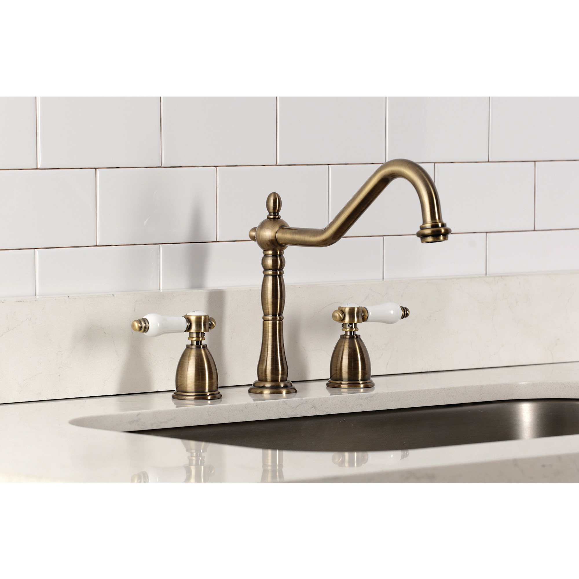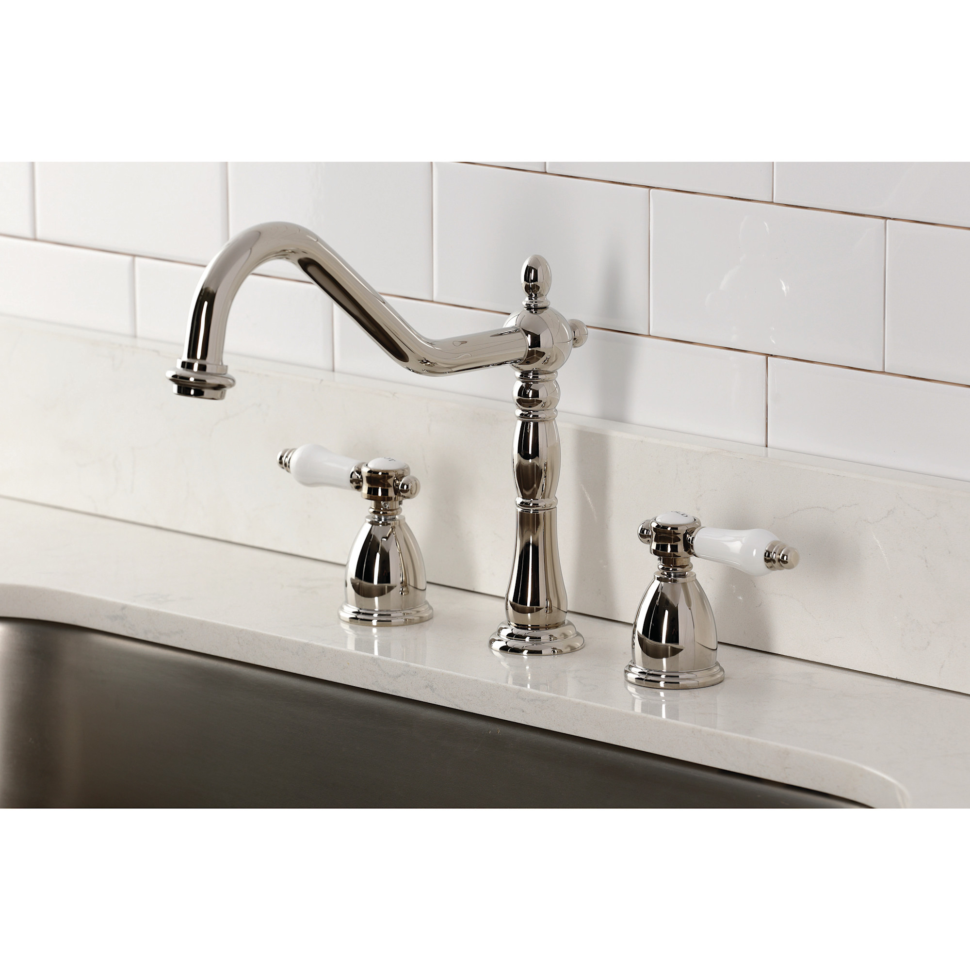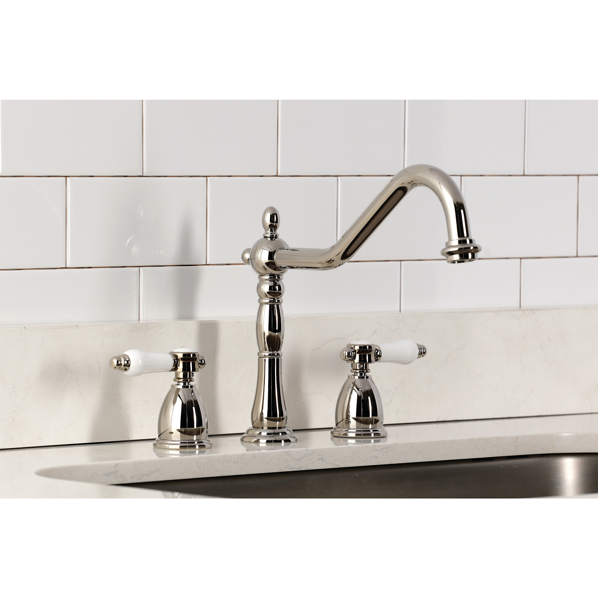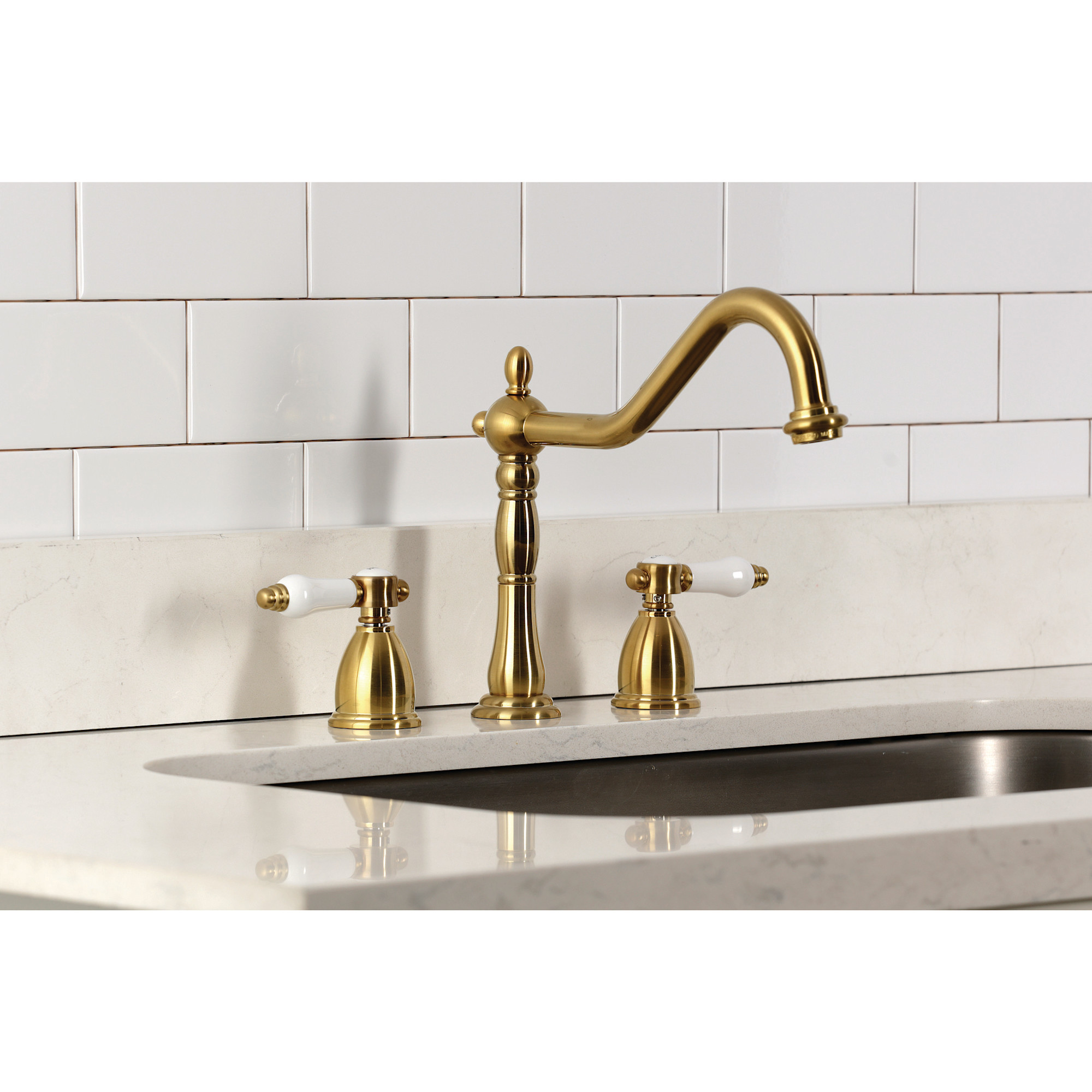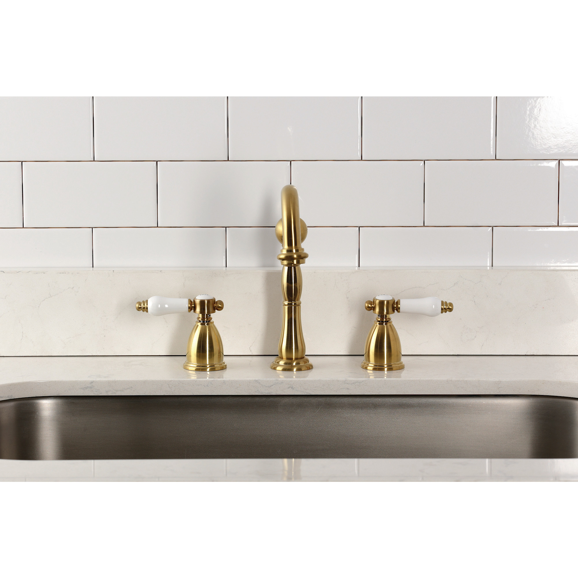 Item DescriptionThe graceful elegance of timeless design is beautifully merged between British flair and Victorian delicacy within this faucet's porcelain levers. Able to fit a variety of sink set-ups, widespread kitchen faucets can be utilized in several multi-hole configurations. These are ideal for larger kitchens, as they are more spread apart. The brushed finish will also provide a long lasting and warm touch to your kitchen ensemble. Allow the brass construction to provide a sturdy and reliant fixture. Matching accessories are available for use.
