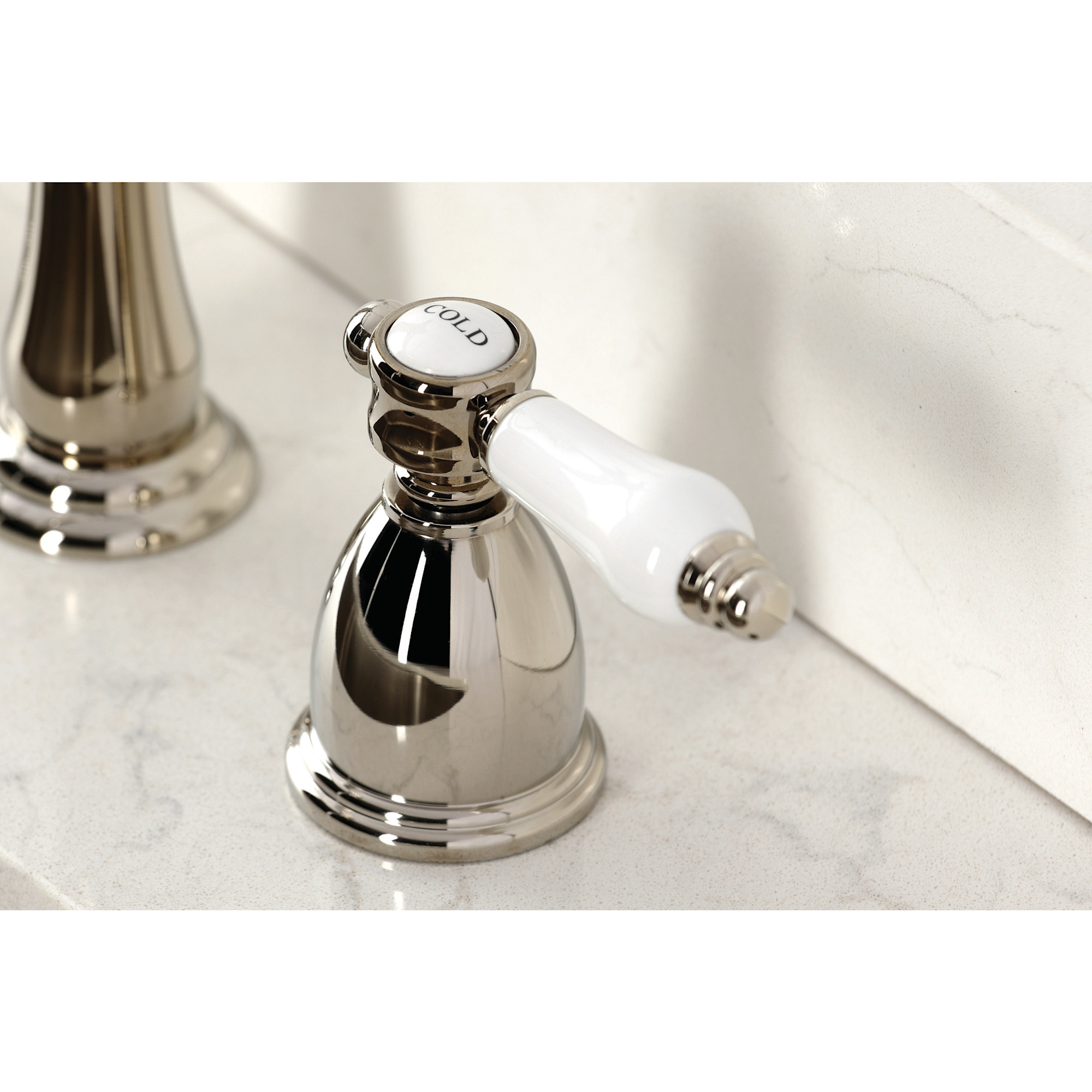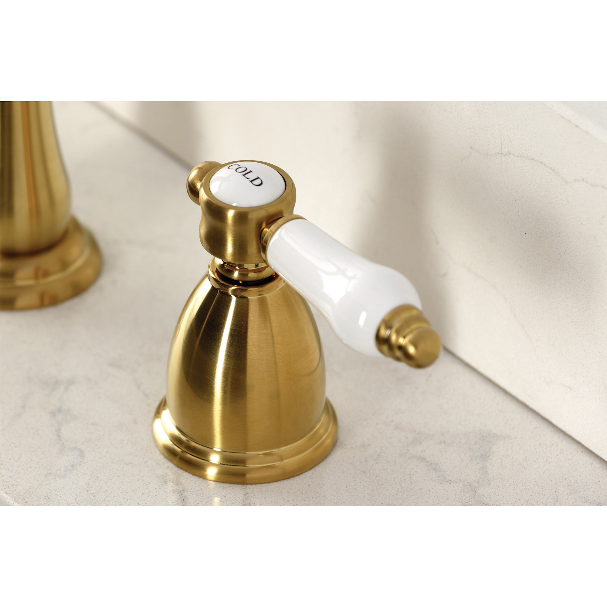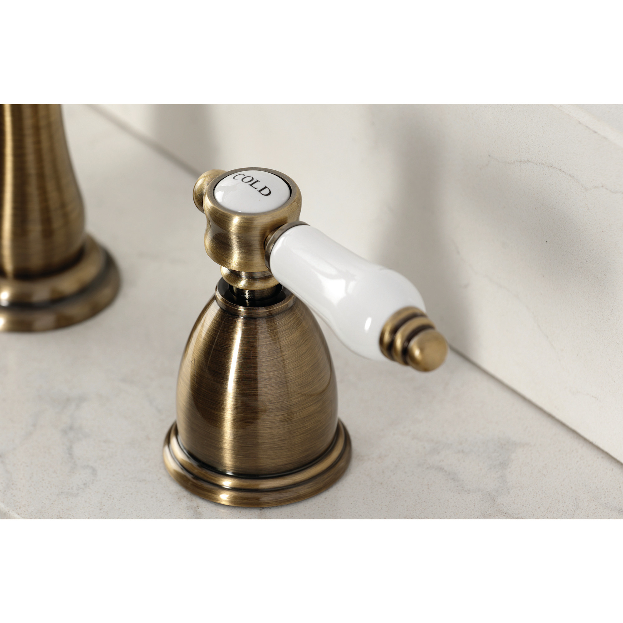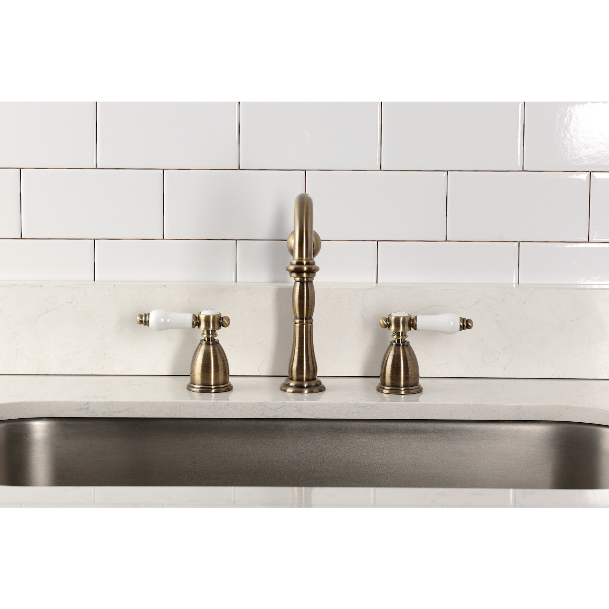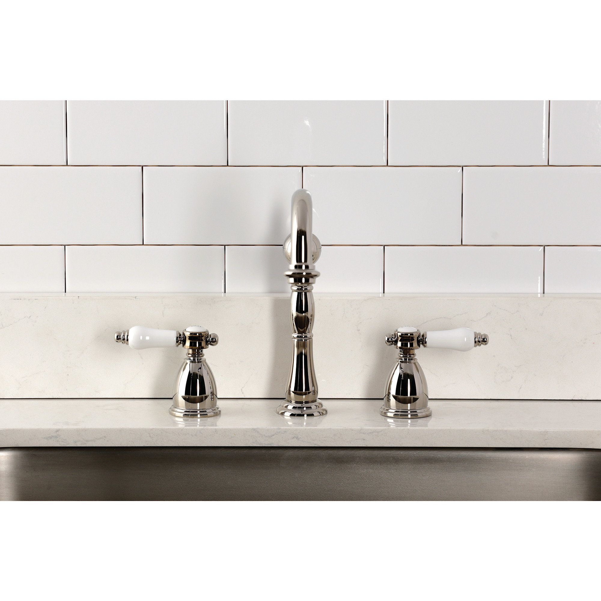 Item DescriptionThe graceful elegance of timeless design is beautifully merged between British flair and Victorian delicacy within this faucet's porcelain levers. Able to fit a variety of sink set-ups, widespread kitchen faucets can be utilized in several multi-hole configurations. These are ideal for larger kitchens, as they are more spread apart. The brushed finish will also provide a long lasting and warm touch to your kitchen ensemble. Allow the brass construction to provide a sturdy and reliant fixture. Matching accessories are available for use.