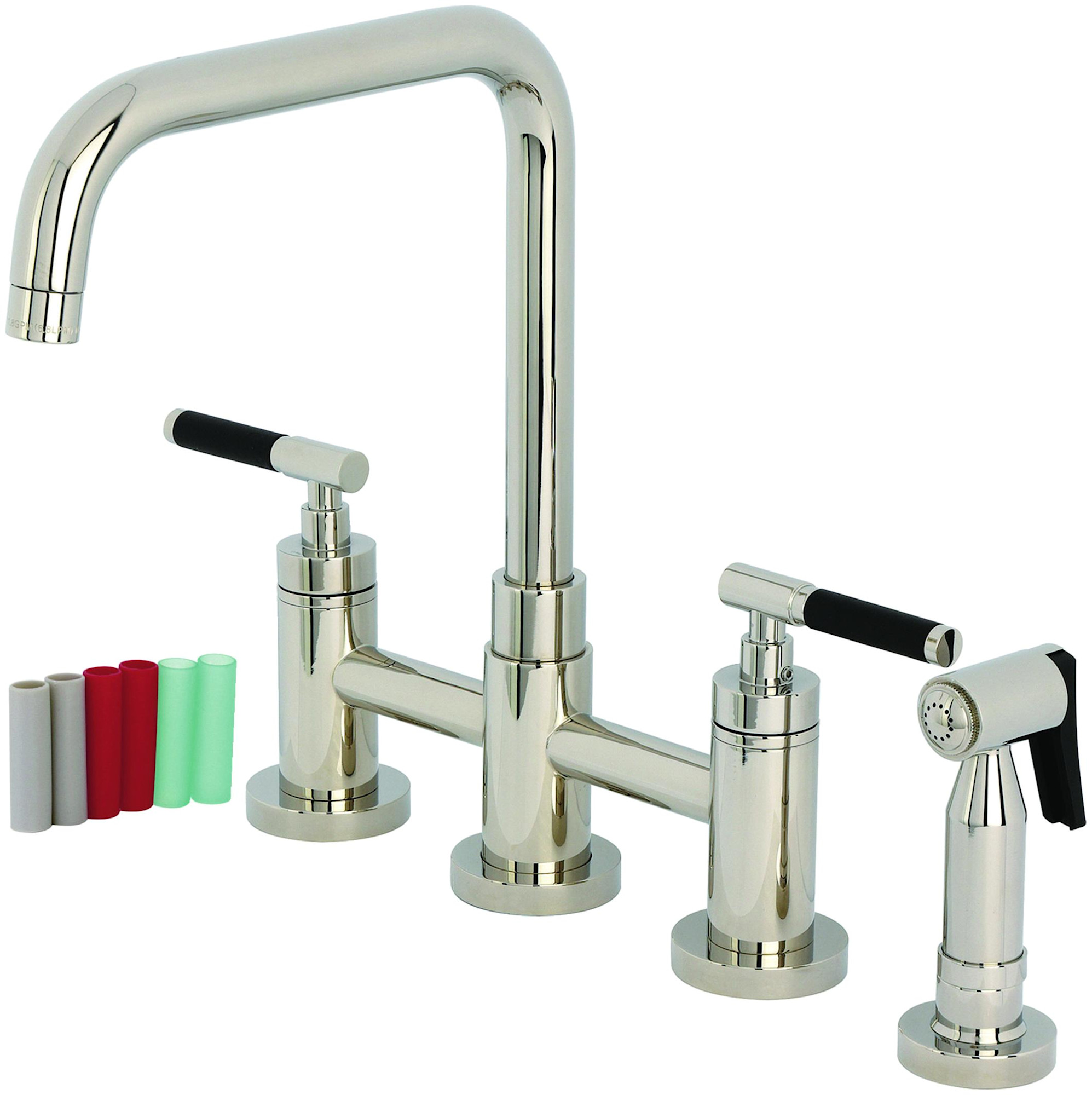 Item DescriptionThis faucet tastefully interweaves top-notch ergonomic design and the sheen of contemporary simplicity with its neoprene accented handles and tubular spout. The brass construction and ceramic cartridge ensures trouble free performance for many years. The 8" projection on the swivel spout and the side spray make this faucet the perfect balance of form and function as the spout will be functional in any size sink and a visual centerpiece in any kitchen