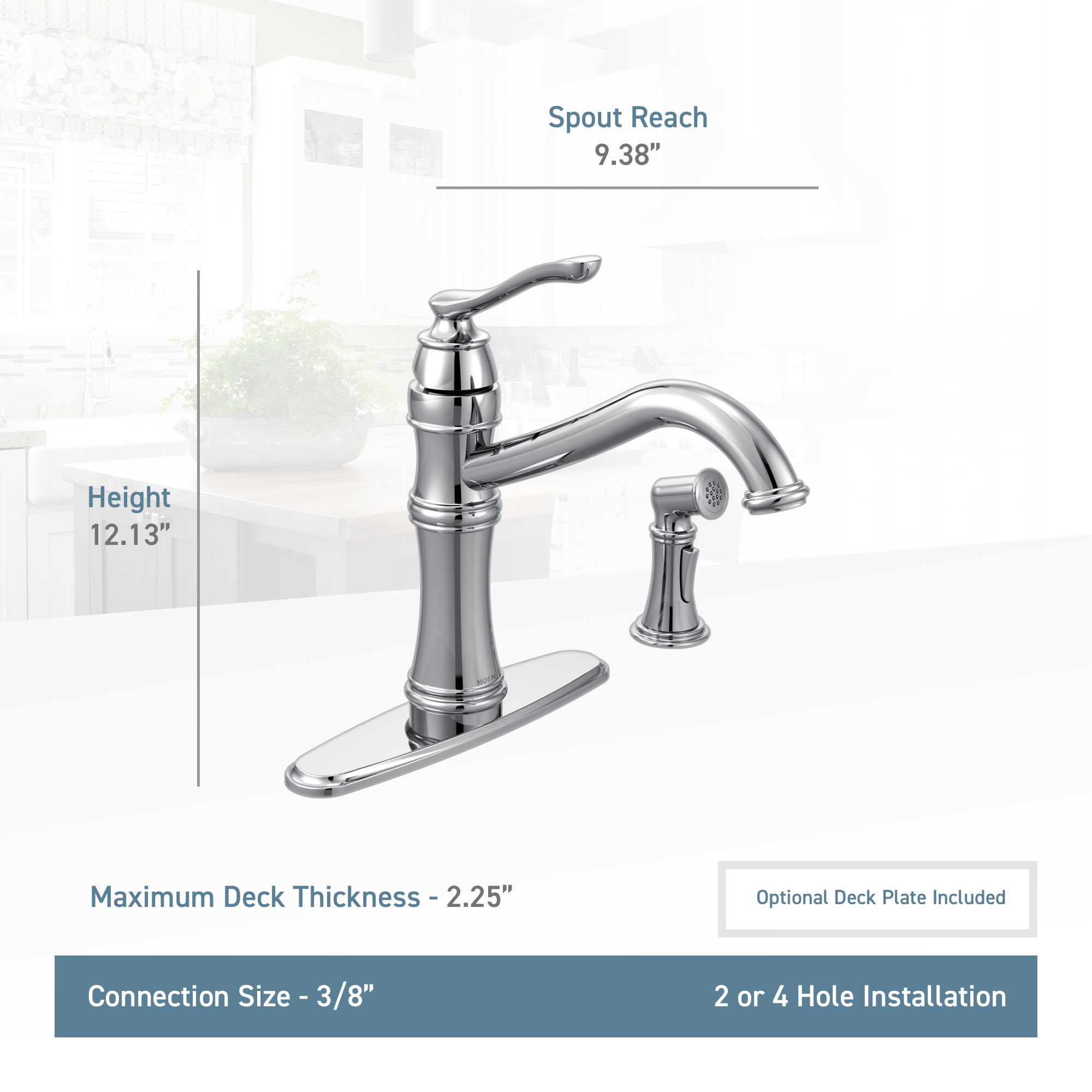 - Includes optional escutcheon (cover plate) – for sinks with 3 faucet holes