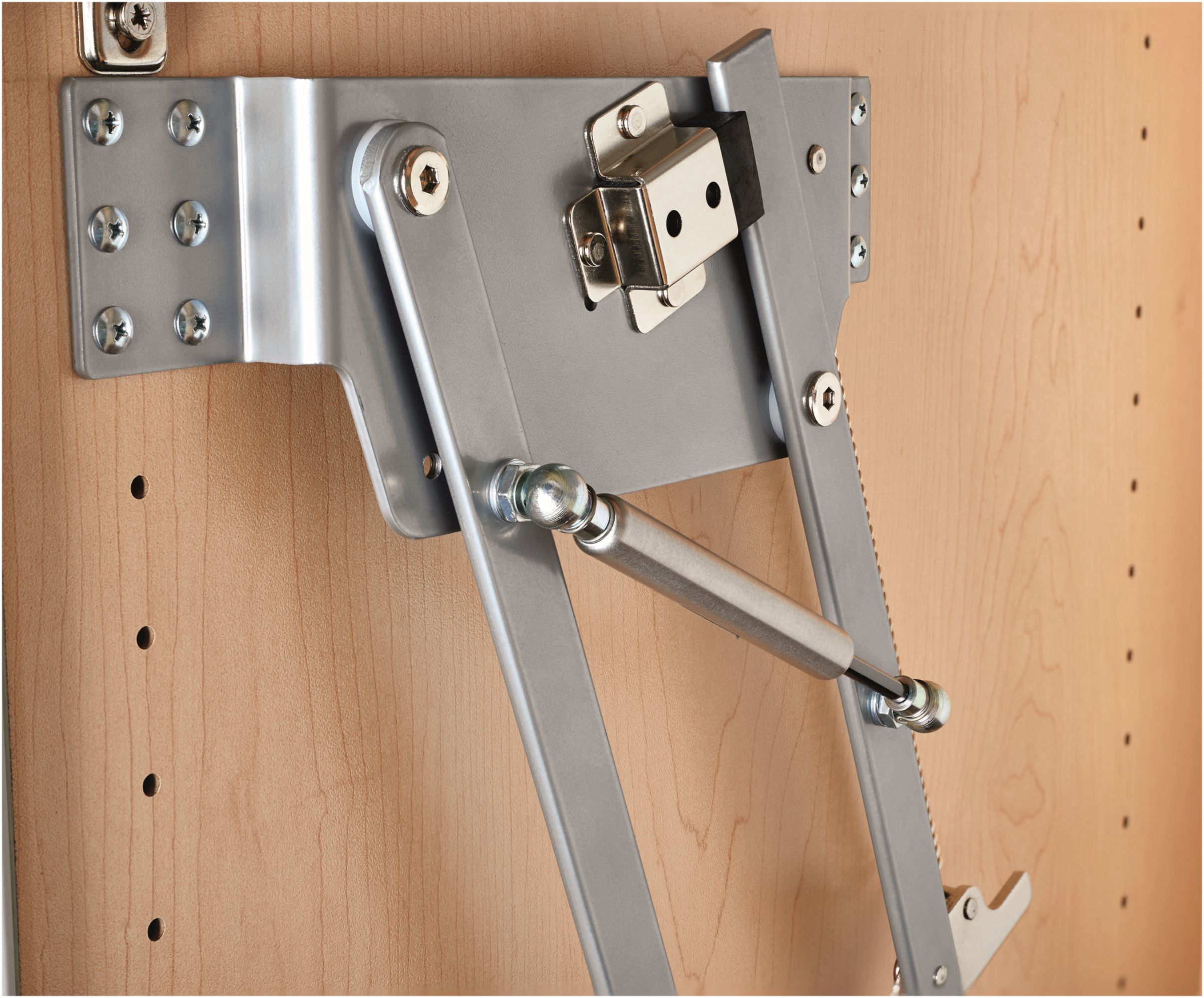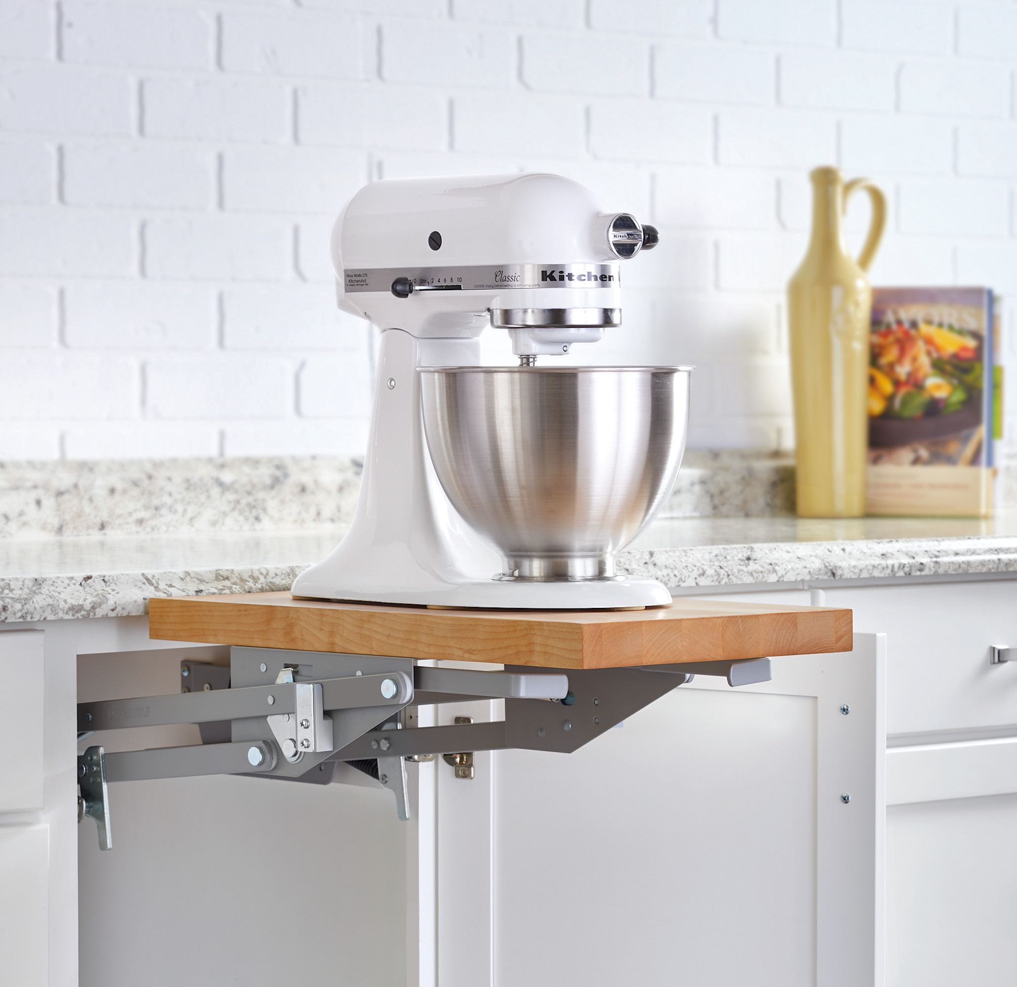 Item DescriptionRev-A-Shelf has kept design and flexibility in mind with this heavy-duty appliance lift system. The lifting mechanism makes lifting heavy or awkward appliances a breeze with its spring-loaded supports with 3 different weight settings. The 1-1/2" thick maple shelf is included and ready to install. Lastly, this unit features two (2) built in dampeners that allow this unit to gently glide back inside of your cabinet with very little assistance needed.